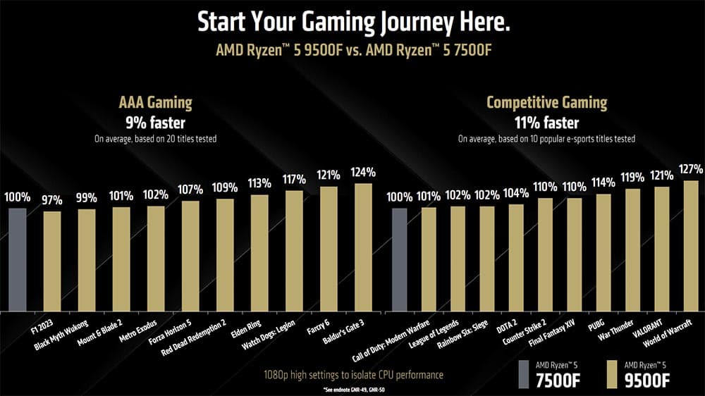 Согласно внутренним тестам AMD, Ryzen 5 9500F показывает прирост до 24% в AAA-играх, таких как Baldur's Gate 3, а средний прирост производительности в 10 различных AAA-играх составляет 9%. В онлайн-играх AMD обещает в среднем на 11% более высокую производительность.
