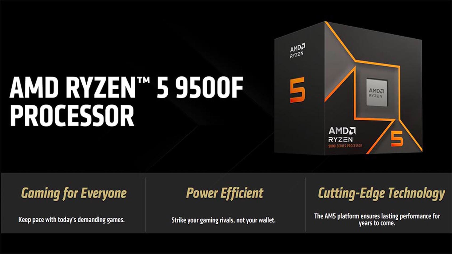Ryzen 5 9500F имеет 6 ядер и поддерживает исполнение 12 потоков, базовая частота составляет 3,8 ГГц, максимальная — 5,0 ГГц. По сравнению с Ryzen 5 9600X максимальная частота ниже на 400 МГц, но остальные характеристики, включая объем кэша L2+L3 и TDP 65 Вт, идентичны. AMD утверждает, что благодаря архитектуре Zen 5, CPU обеспечивает заметный прирост производительности в играх по сравнению с Ryzen 5 7500F.