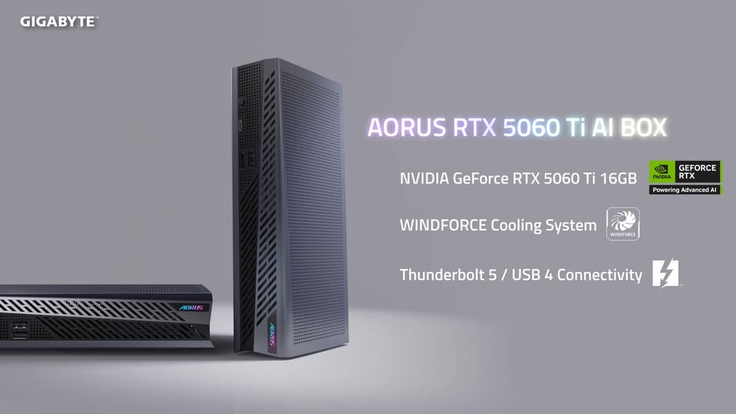 Модель Aorus RTX 5060 Ti AI Box, как ясно из названия, основана на GeForce RTX 5060 Ti, которая намного мощнее RX 7600M XT, да и памяти в этом случае предлагает 16 ГБ.