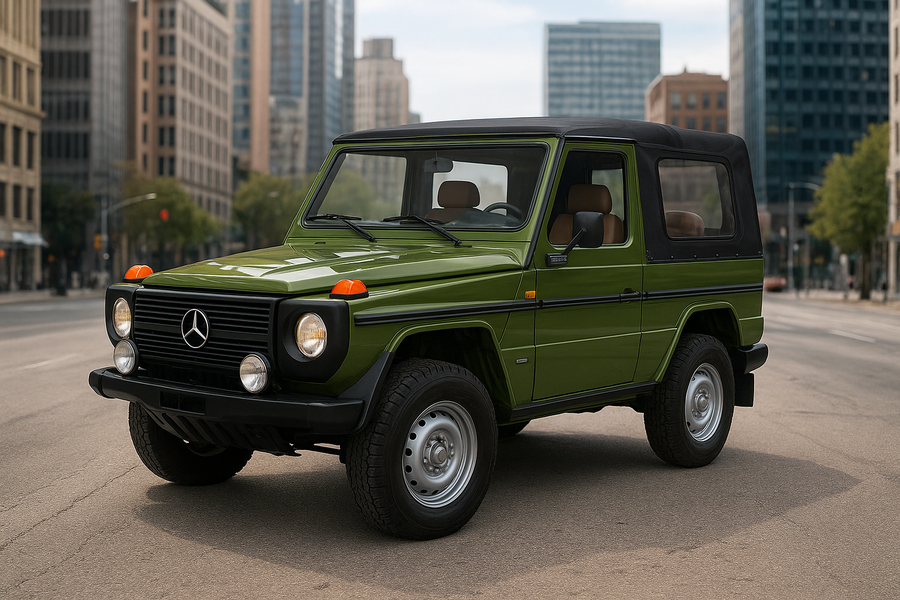 Этот Mercedes-Benz G-класса со съёмным мягким верхом окрашен в классический зеленый цвет — здорово напоминает УАЗ-469. Внедорожник оснащен бензиновым мотором объемом 2,3 литра мощностью 90 л.с. и 5-ступенчатой механической коробкой передач. В трансмиссии предусмотрена блокировка обоих межколесных дифференциалов. Максимальная скорость составляет 128 км/ч.
