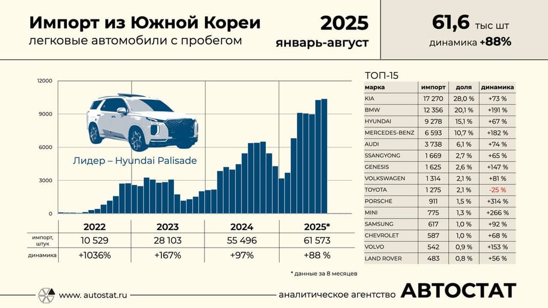 В январе-августе 2025 года в Россию было импортировано 61,6 тысячи легковых автомобилей с пробегом из Южной Кореи, что на 88% больше, чем за аналогичный период прошлого года.