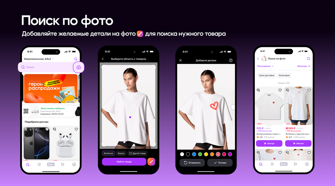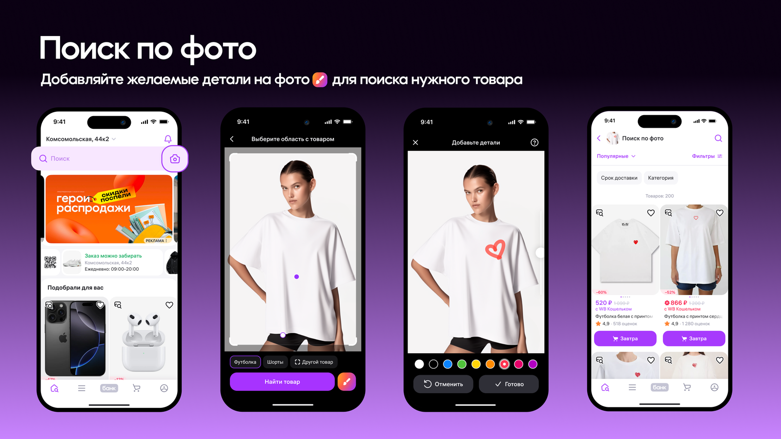 Команда крупнейшей российской торговой онлайн-площадки Wildberries представила новое поколение поиска по фото в мобильном приложении. Теперь алгоритмы способны распознавать не только фотографии, но и артикулы или рисунки: пользователь может загрузить картинку, дорисовать недостающий элемент или поменять цвет — и система найдёт аналогичные товары на маркетплейсе. Об этом сообщила пресс-служба объединенной компании Wildberries и Russ.