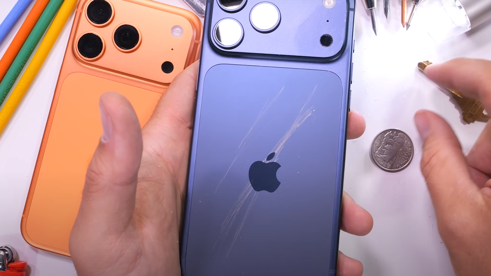 Техноблогер Зак Нельсон с канала JerryRigEverything протестировал iPhone 17 Pro и подтвердил, что смартфон легко подвержен царапинам, особенно на острых краях модуля камер.