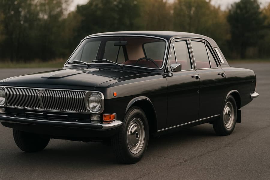 «Волга» отличается классическим чёрным кузовом и красным салоном. Под капотом установлен оригинальный бензиновый двигатель мощностью 102 л.с., в оснащение входят механическая коробка передач и задний привод.