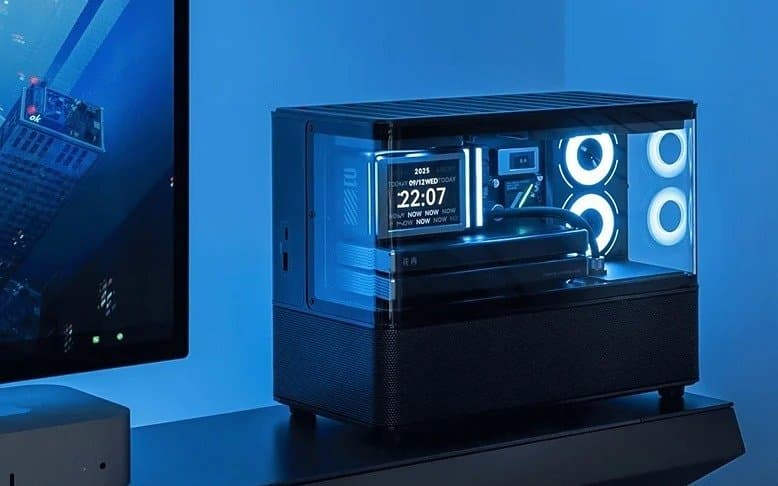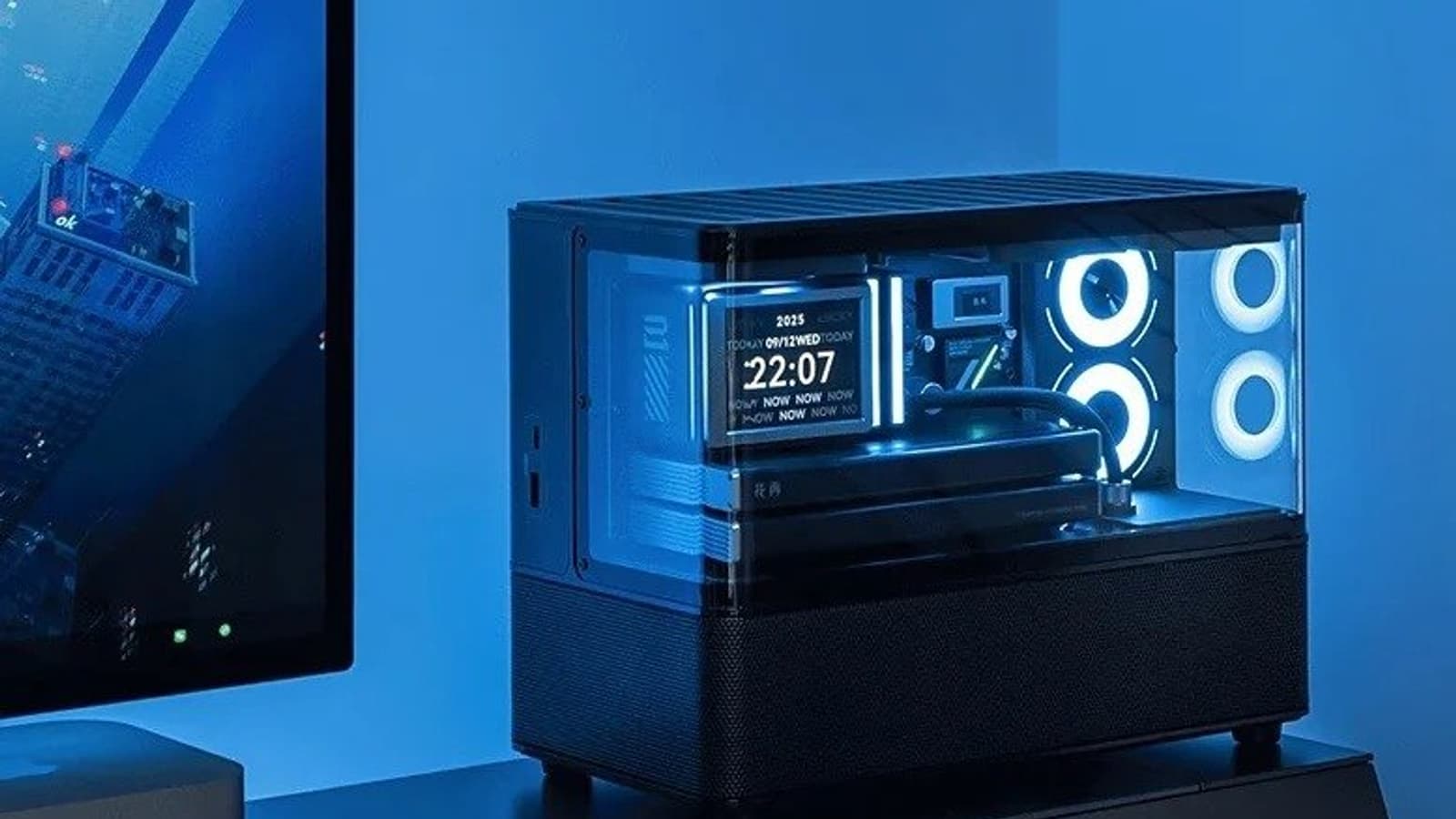 Нижняя часть представляет собой акустическую зону, а три прозрачные стенки в верхней части создают ощущение небольшого системного блока.