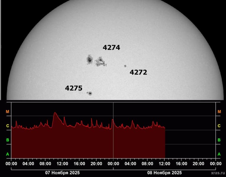 Главный источник беспокойства — активная область №4274, одна из самых долгоживущих и мощных за последнее время. Она появилась в середине октября, уже произвела более сотни вспышек, включая несколько взрывов класса X, успела обойти Солнце и снова вернулась «лицом к Земле». На данный момент 4274 излучает много мелких и средних вспышек, что грозит слабыми и умеренными магнитными бурями (уровней G1 и G2).