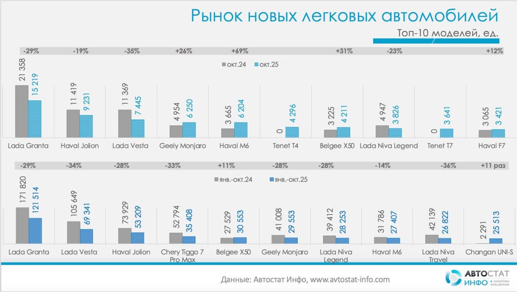 Особенно заметен провал у Geely: за год минус 54 тыс. машин, а за октябрь — ещё минуc 17%.