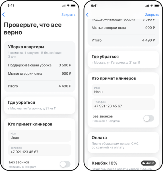 Статус заказа можно отслеживать в разделе «Уборка». Услуга предоставляется без предоплаты, всю сумму клиент платит после окончания уборки. Решение любых вопросов, связанных с клинингом, производится в приложении — через чат поддержки мобильного банка. Исполнителем выступает компания Airo.