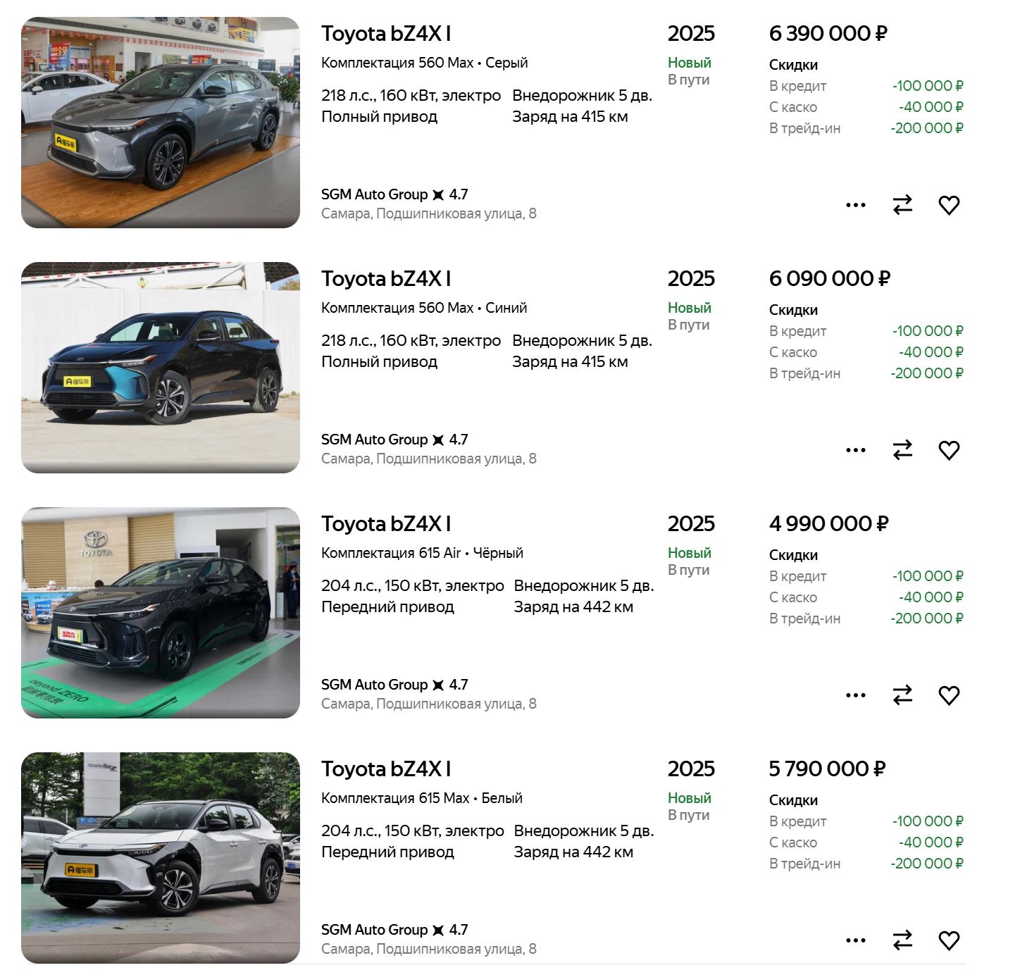 В Россию едет партия электрических кроссоверов Toyota bZ4X 2025 года выпуска. Машины — в трех комплектациях (615 Air, 615 Max и 560 Max), стоимость — от 4,99 до 6,39 млн рублей.