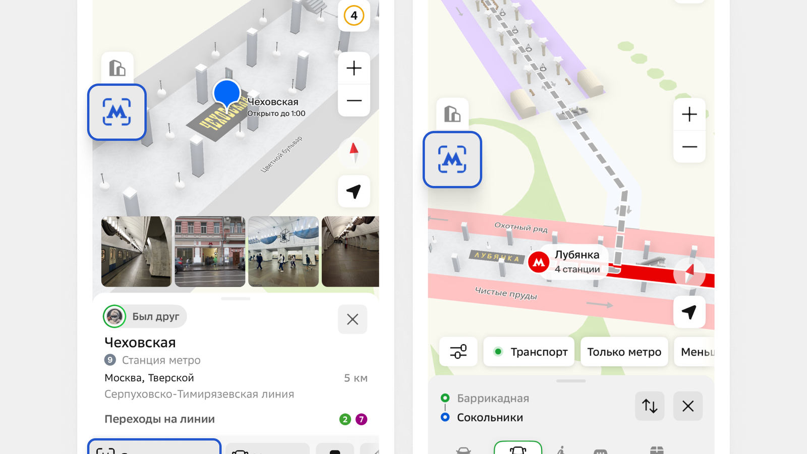 Посмотреть схемы можно, нажав на кнопку «Схема станции» в карточке станции или входа в метро, для которой есть схема. В 2ГИС можно посмотреть весь путь в метро — от входа, через эскалаторы и переходы между станциями, до выхода. На карте появились детальные планы с турникетами, кассами, зарядными станциями для телефонов, банкоматами, можно увидеть люстры, колонны и даже модели поездов, которые приходят на станцию. Кроме этого, в слое метро можно посмотреть схематичные очертания подземных частей станций для всех станций в Москве.