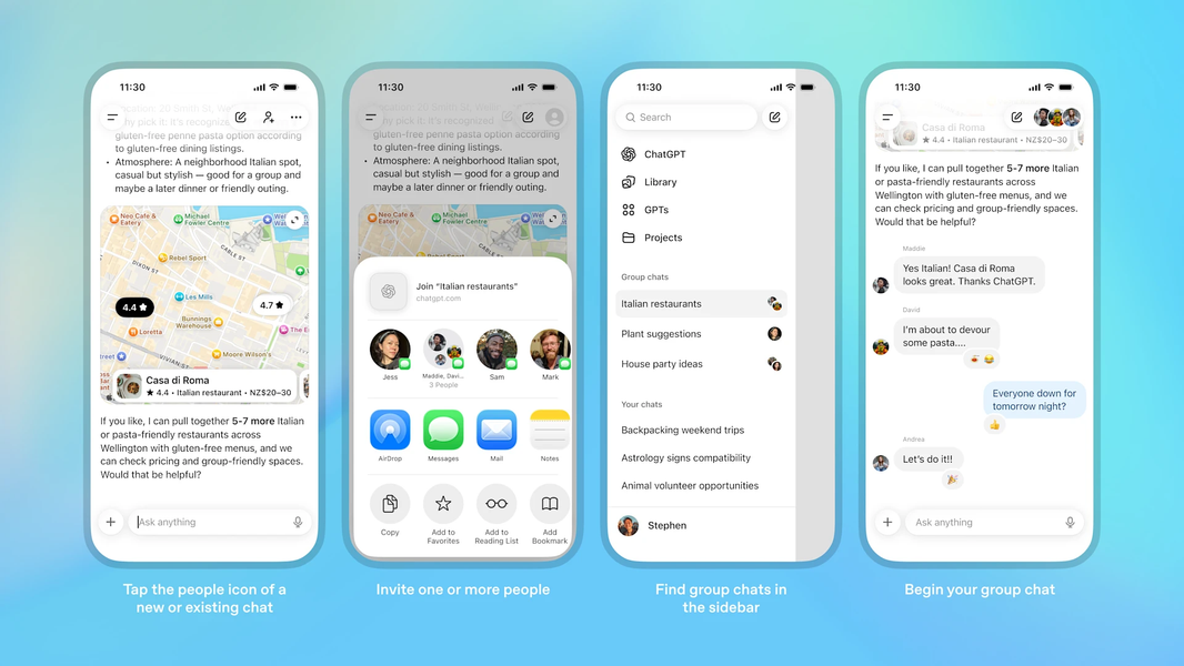 Компания OpenAI начала пилотное тестирование групповых чатов в ChatGPT. Как и в групповых чатах в мессенджерах, в ChatGPT можно общаться с друзьями, семьёй или коллегами. В данном случае чат-бот ChatGPT выступает одним из участников беседы, помогая составить маршрут для отпуска, предлагая идеи для ремонта или помогая найти ресторан, который понравится всем собеседникам.