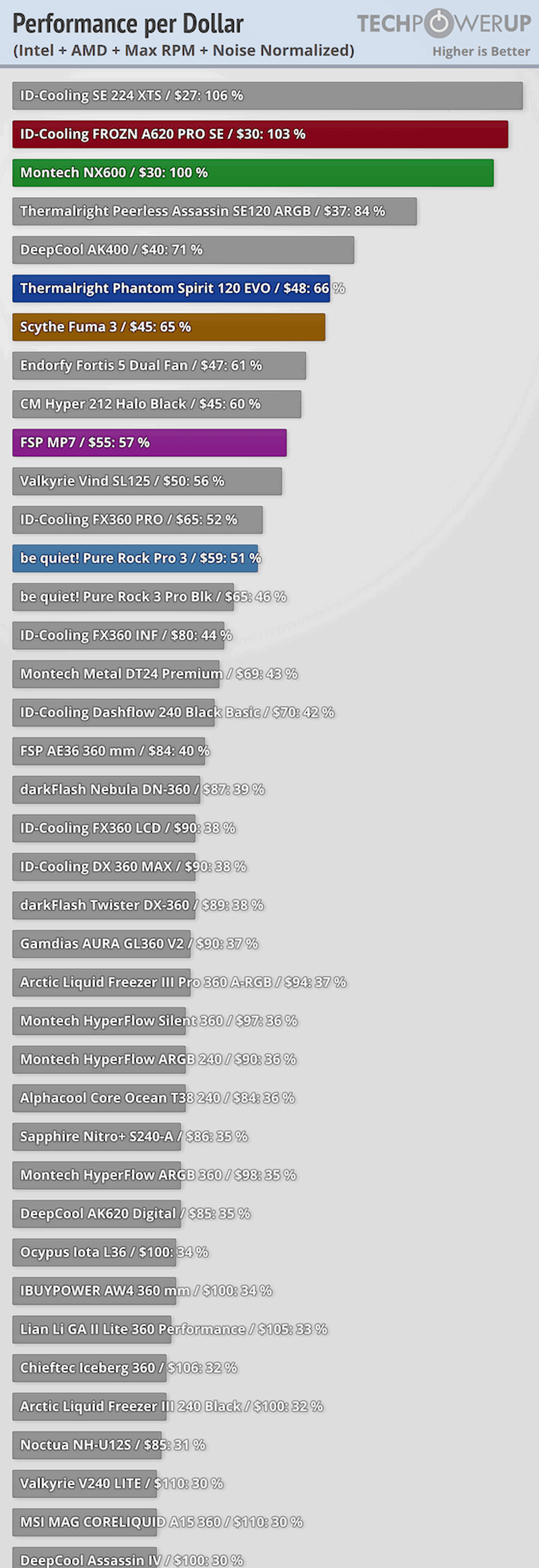 Вентиляторы вращаются со скоростью 800-2000 об/мин при уровне шума не выше 34 дБА. Сам производитель не указывает, на какую мощность рассчитан кулер, но авторы TechPowerUp уже протестировали новинку. Они говорят, что производительность у кулера выше, чем у многих других решений этого класса, правда, при этом новинка шумновата.