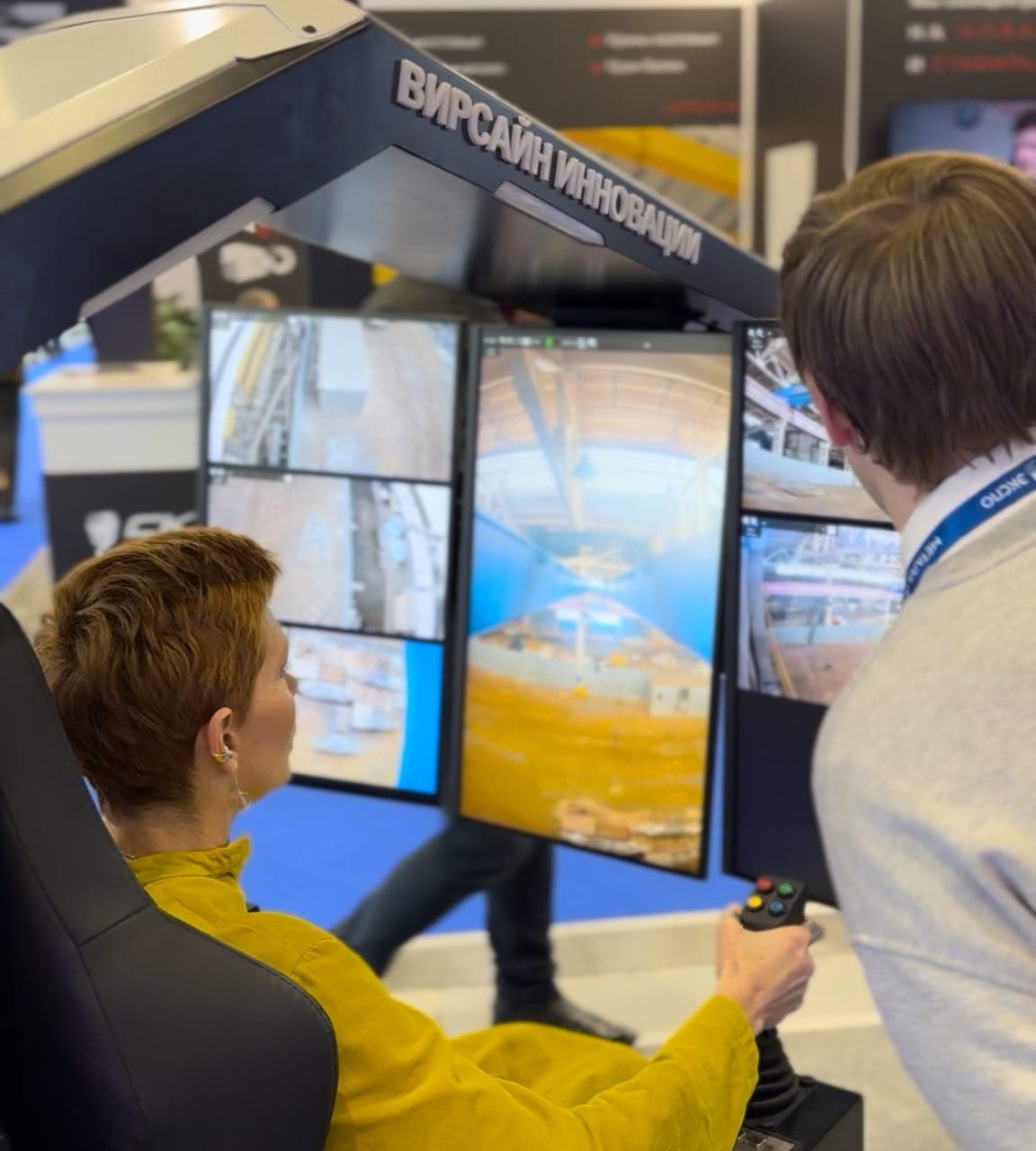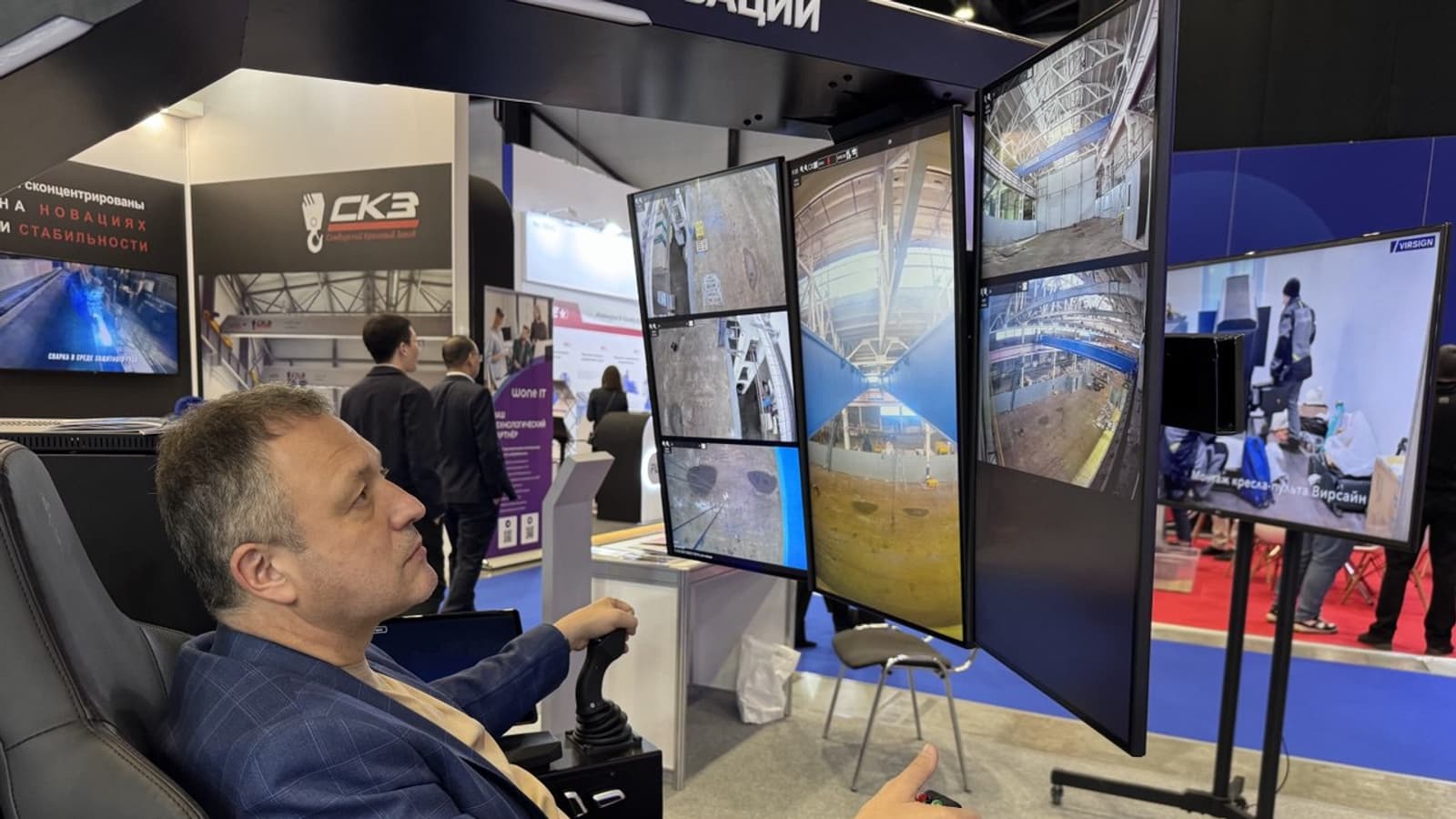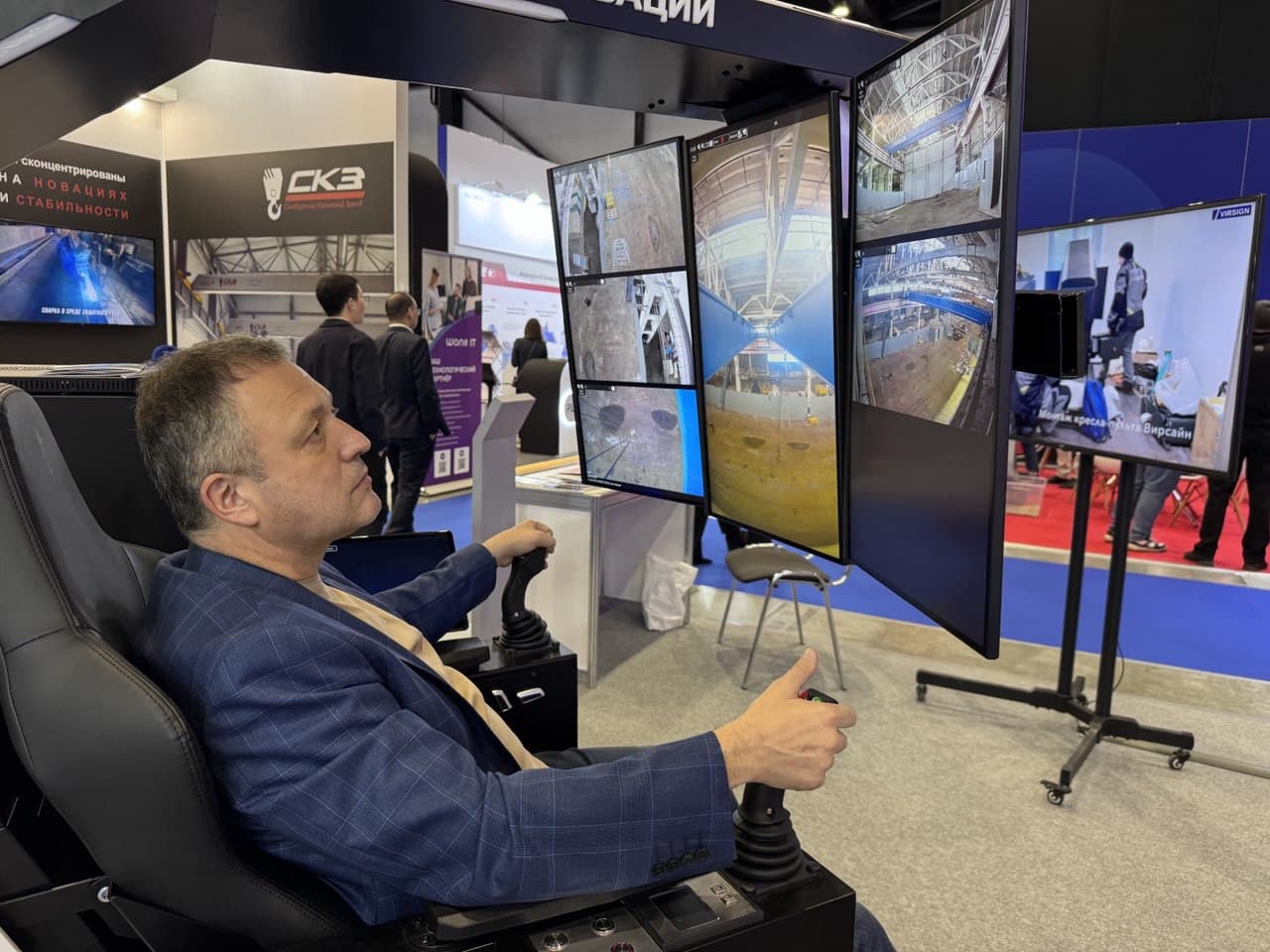 На выставке желающие могли сесть в кресло оператора и управлять мостовым краном грузоподъемностью 5 тонн. При этом сам кран физически находится на расстоянии в 1000 км – на заводе «Машинвест» в г. Донской Тульской области. Он оснащен функциями антираскачки, видеомониторинга с отслеживанием людей, защитой от столкновений. Генеральный директор «Интехкома» Игорь Овян рассказал:
