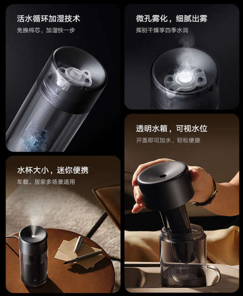 Питание осуществляется через USB-C, потребление составляет всего 4,5 Вт. Предусмотрены механизмы безопасности, включая автоматическое выключение при наклоне более чем на 60° или при низком уровне воды. Устройство выдерживает температуру до 85°C внутри корпуса (то есть увлажнитель можно оставлять в салоне машины, оставленной на солнце). Уровень шума — менее 32 дБ(A).