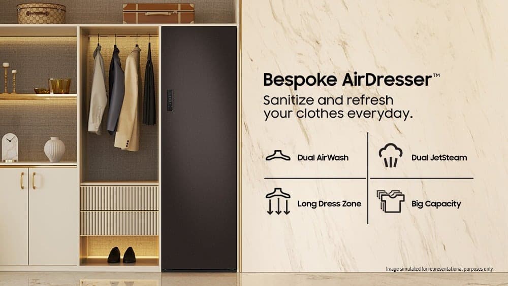 Устройство также синхронизируется с приложением SmartThings, предоставляя рекомендации по уходу и напоминания о регулярном обслуживании фильтров и резервуаров. Устройство предназначено для сохранения деликатных тканей, включая шёлковые сари, шифоновые модели, шерстяные смеси, такие как кашемир или меринос, а также пиджаки, часто используемые в деловом гардеробе.
