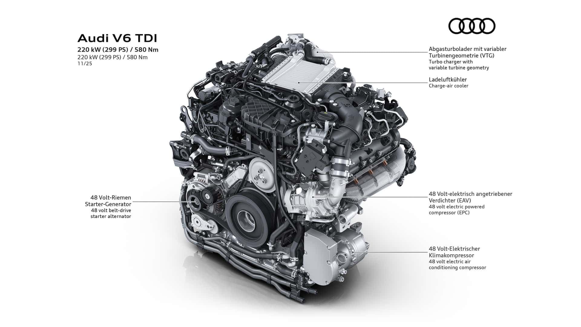 Новый двигатель дебютирует на моделях A6 и Q5. Это первый V6 TDI Audi, в котором 48-вольтовая надстройка сочетается с электроприводом компрессора, установленным после турбины и интеркулера. При резком нажатии газа система направляет воздух на электрокомпрессор, который мгновенно повышает давление наддува, обеспечивая почти полное отсутствие турбоямы. Audi утверждает, что отклик нового V6 сопоставим с электромобилем аналогичной мощности.