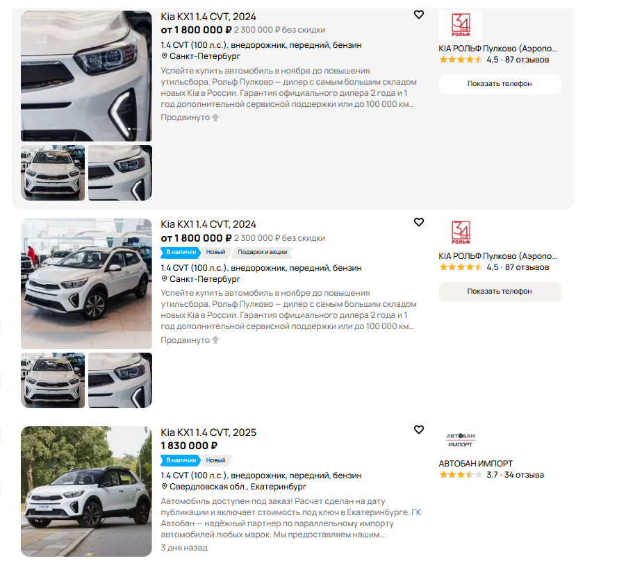 Крупный дилерский «Kia Рольф» продаёт такие машины с автосалонами в Москве и Санкт-Петербурге по цене от 1,8 млн рублей, при этом предлагает на них собственную гарантию 100 000 км пробега или 2 года плюс дополнительный год сервисного обслуживания.