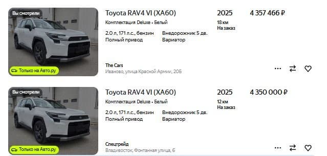 Российские компании начали принимать заказы на совершенно новый Toyota RAV4 (XA60). Привезти машину предлагают из Китая, где продажи новинки только-только стартовали. На данный момент доступен только один вариант: с 2,0-литровым мотором мощностью 171 л.с., вариатором и полным приводом. Компания из Иваново за такую машину просит 4 357 466 рублей, компания из Владивостока — 4,35 млн рублей.