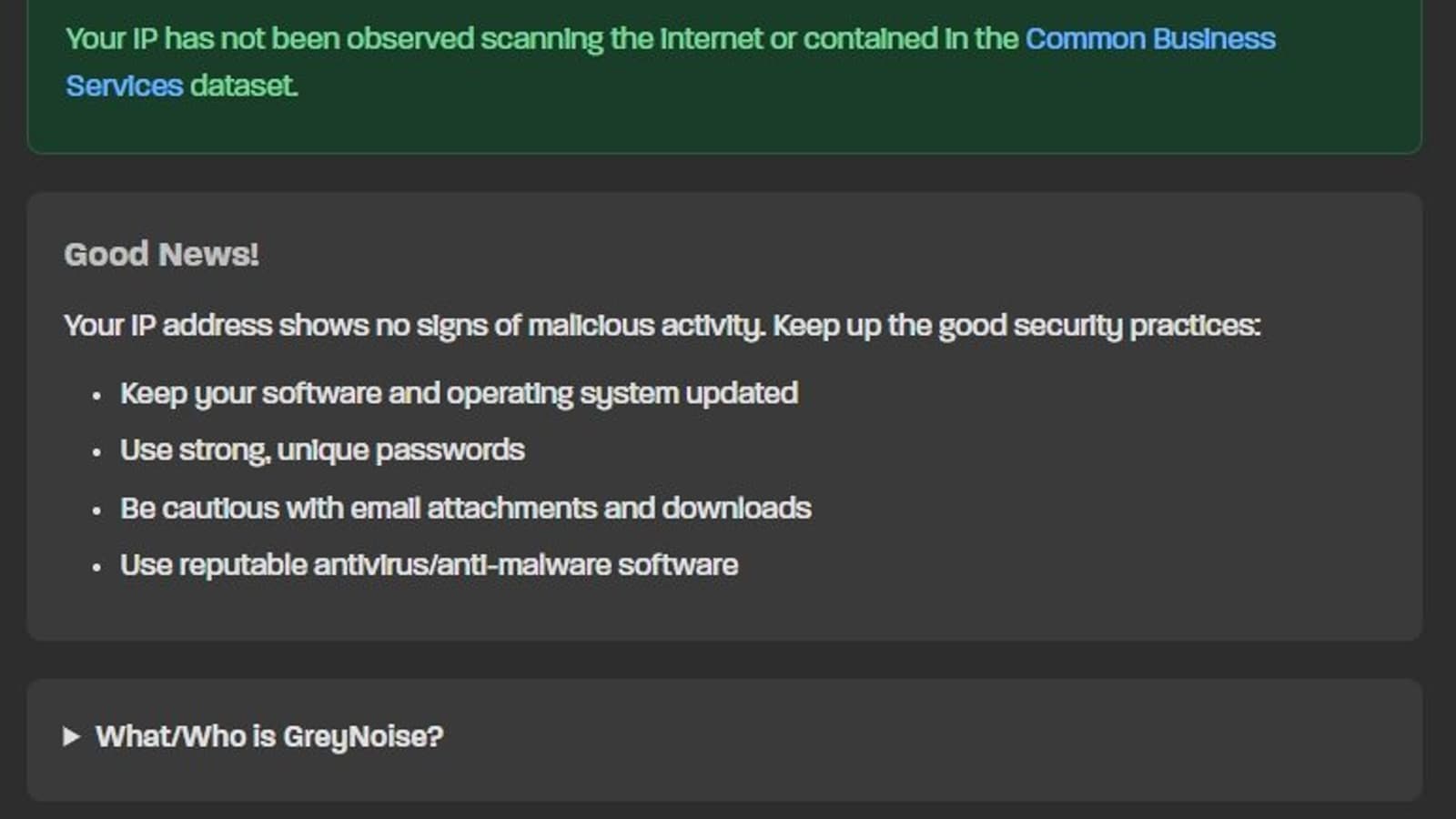 Достаточно просто зайти на сайт check.labs.greynoise.io, и он автоматически просканирует данные и выдаст результат.