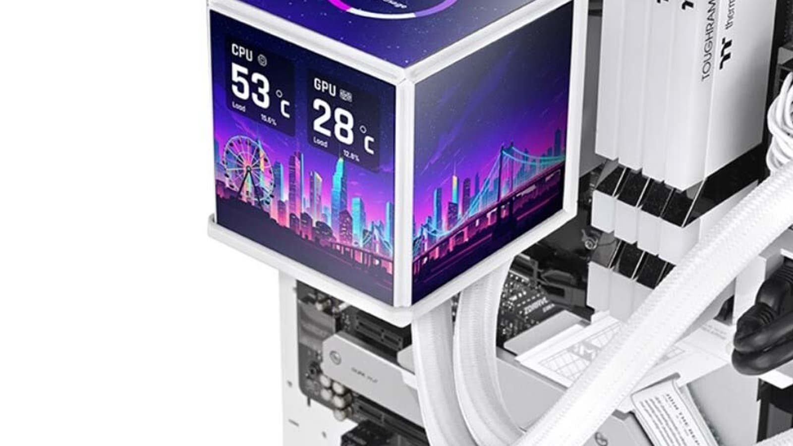 MiniCube 360 Ultra ARGB Sync AIO выделяется тем, что на процессор тут крепится вполне себе крупный куб, у которого все грани, кроме двух, закрыты экранами. Каждый дисплей имеет диагональ 3,95 дюйма с разрешением 720 х 720 пикселей, то есть это довольно крупная конструкция. На каждый можно выводить своё изображение либо же какое-то одно будет разделено на каждую грань. Кроме того, на экраны можно вывести ещё и полезную информацию вроде температуры CPU и прочего.