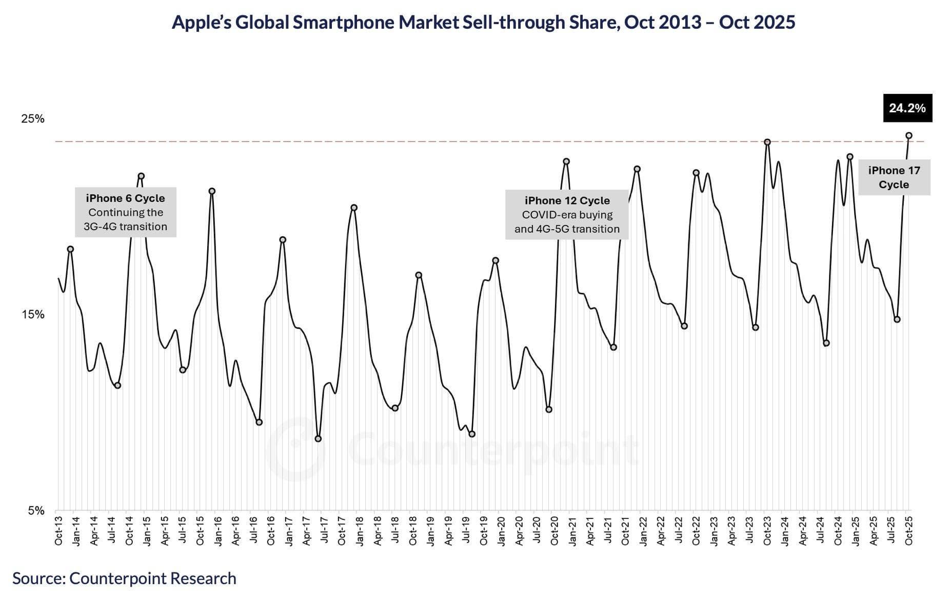 В октябре доля Apple на мировом рынке смартфонов достигла рекордных 24,2%. В октябре 2025 года мировые продажи смартфонов Apple выросли на 12% в годовом исчислении. Этому в основном способствовали высокие продажи серии iPhone 17, особенно на рынках США и Китая.