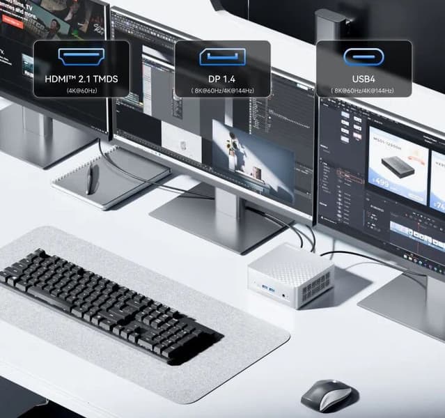 Масса устройства составляет 600 граммов, мини-ПК можно закрепить на стене или на задней панели монитора. Для подключения последнего предусмотрены порты HDMI 2.1 и DP 1.4. Также есть пара USB-A 2.0 и USB-A 3.2 Gen2.
