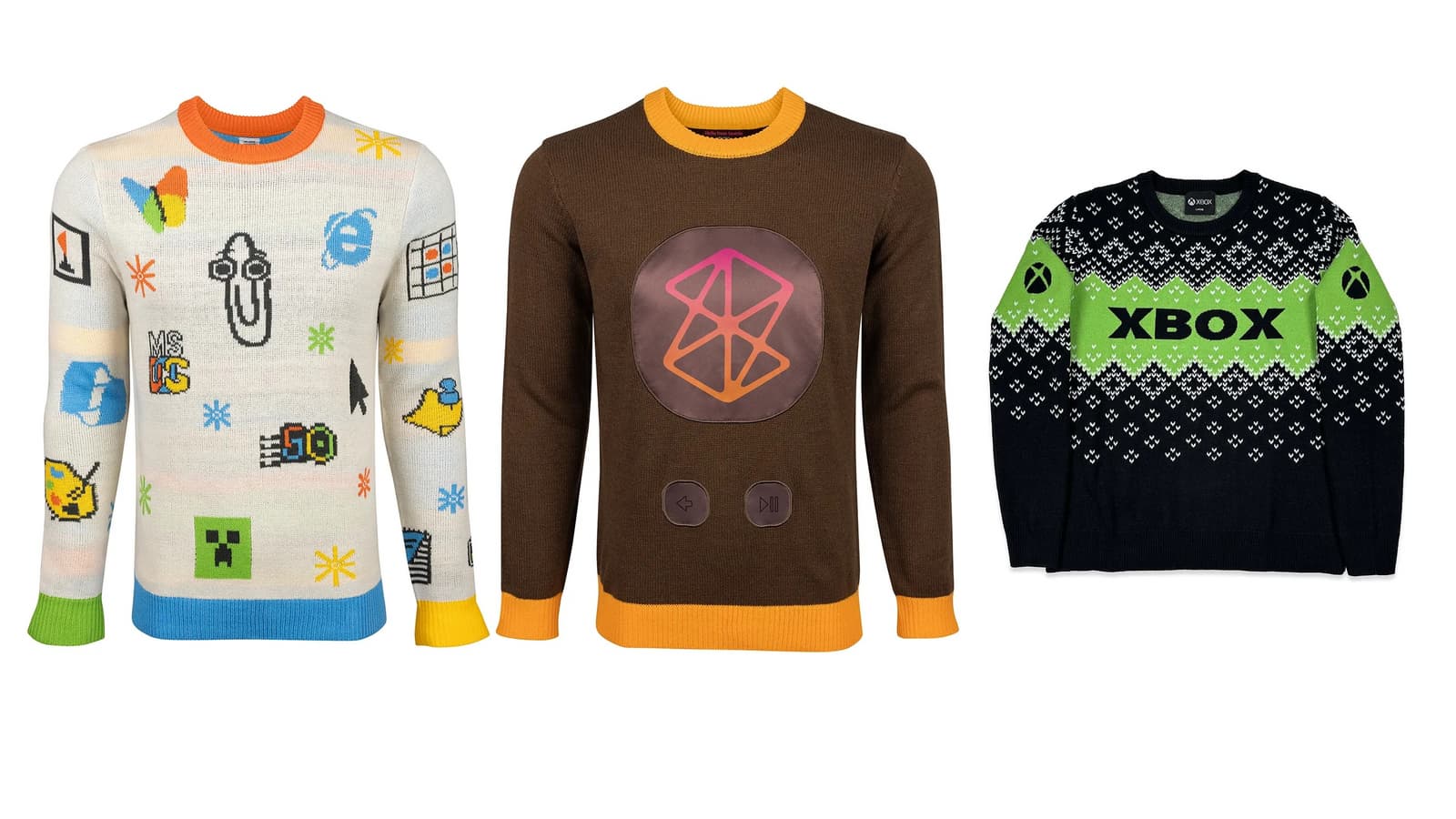 Итак, у нас есть чёрно-зелёный свитер Xbox Holiday Sweater, коричневый Zune Holiday Sweater, посвящённый сервису Zune, который закрыли более 10 лет назад, а также наиболее классический для «уродливых» свитеров вариант Artifact с множеством различных значков и изображением культового виртуального помощника Clippy.