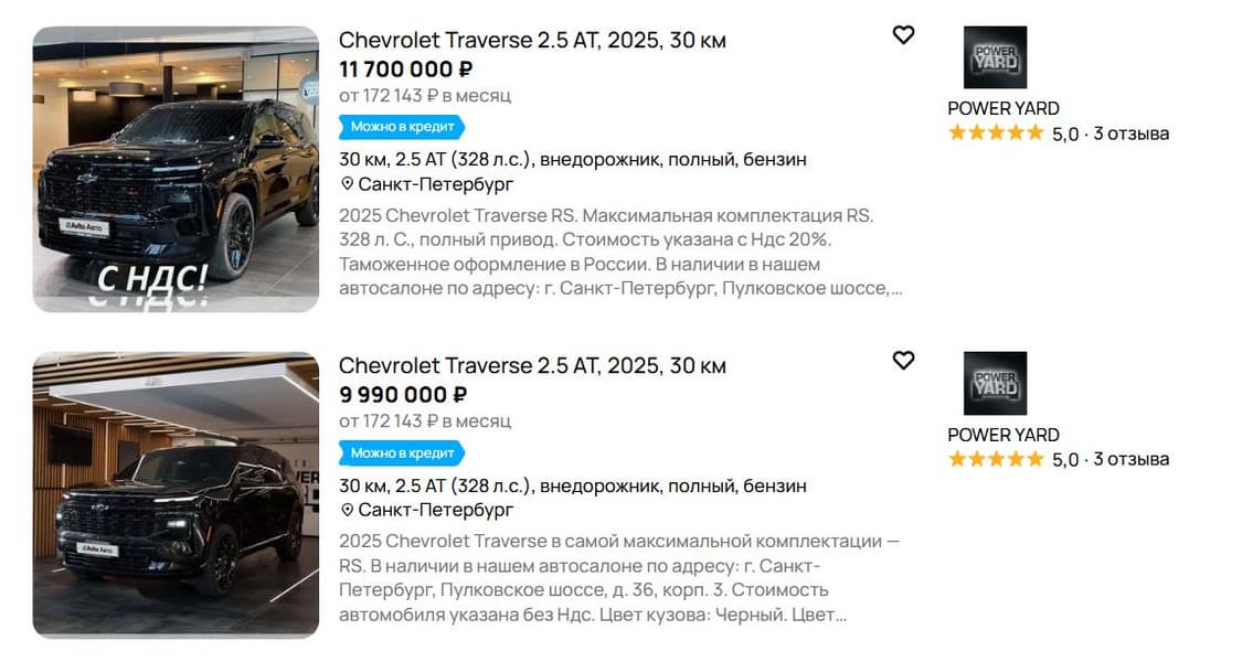 В продаже в России появился Chevrolet Traverse нового поколения — крупный 7-местный кроссовер 2025 года выпуска доступен в Санкт-Петербурге. Машины в наличии, стоимость варьируется от 9,99 до 11,7 млн рублей.