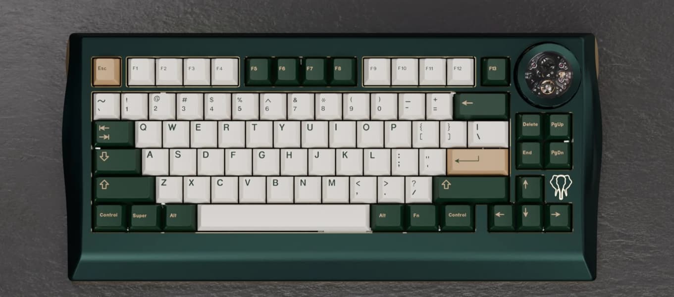 Что касается обычной части клавиатуры, это модель формата 80% в металлическом корпусе. Тут, к слову, тоже есть выбор из двух вариантов: алюминиевый либо латунный корпус, что весьма необычно. Клавиатура тяжёлая даже по меркам механических, так как весит более 6,6 либо 8,6 кг в зависимости от версии.