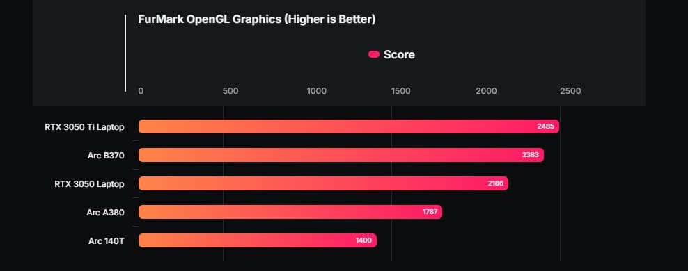 RTX 3050 Ti Laptop быстрее совсем незначительно. Также можно отметить, что Arc B370 на 33% быстрее Arc A380 и на 70% превосходит iGPU Arc 140T.