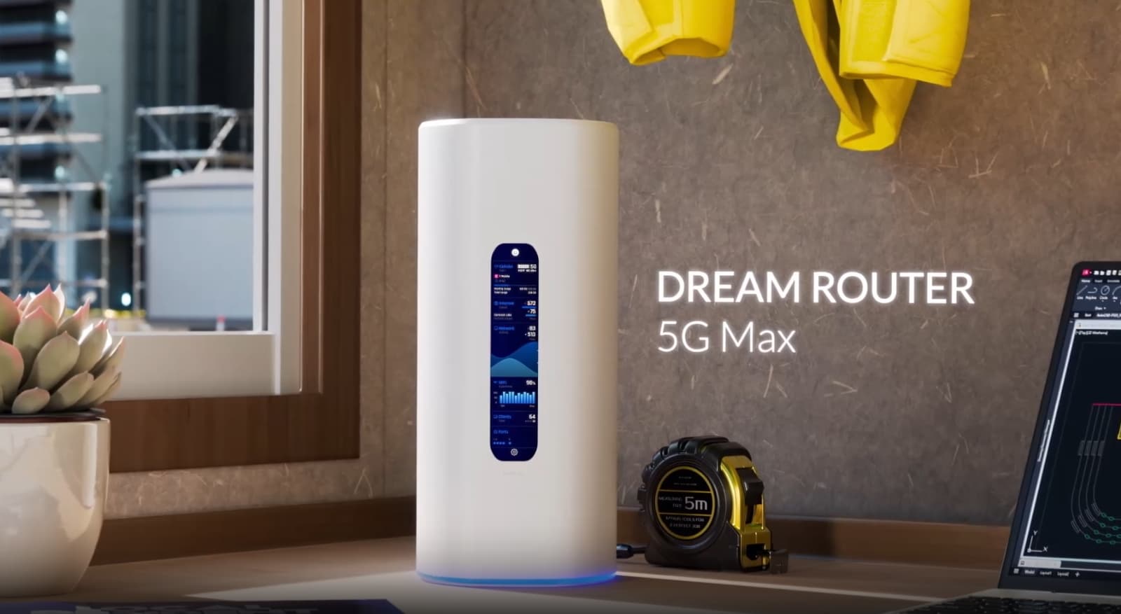 Dream Router 5G Max — облачный шлюз с интегрированной поддержкой 5G, Wi-Fi 7 и операционной системой UniFi OS. Устройство выполнено в цилиндрическом корпусе размерами 110 × 110 × 250 мм, оснащено слотом nanoSIM и поддерживает eSIM. В сетях 5G NSA роутер обеспечивает скорость до 3,4 Гбит/с на загрузку и 560 Мбит/с на отправку. В режиме 5G SA скорости составляют 1,8 Гбит/с и 650 Мбит/с соответственно.