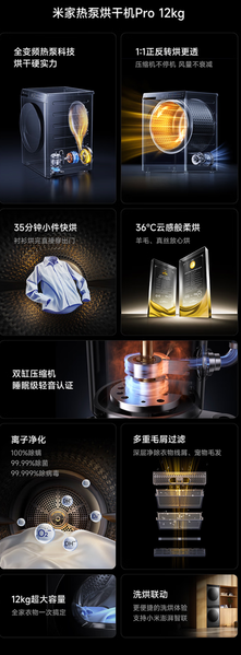 Сушильный модуль получил тепловой насос нового поколения и систему «прямого и реверсивного вращения», которая обеспечивает более равномерную сушку. Поддерживаются 35-минутная быстрая сушка мелких вещей и бережный режим при 36°C. Установка оснащена двойным компрессором с уровнем шума, сопоставимым с ночным режимом, и системой ионизации, обеспечивающей 100% удаление клещей и обезвреживания вирусов. Как и стиральная машина, сушилка подключается к платформе HyperOS Smart Connect.