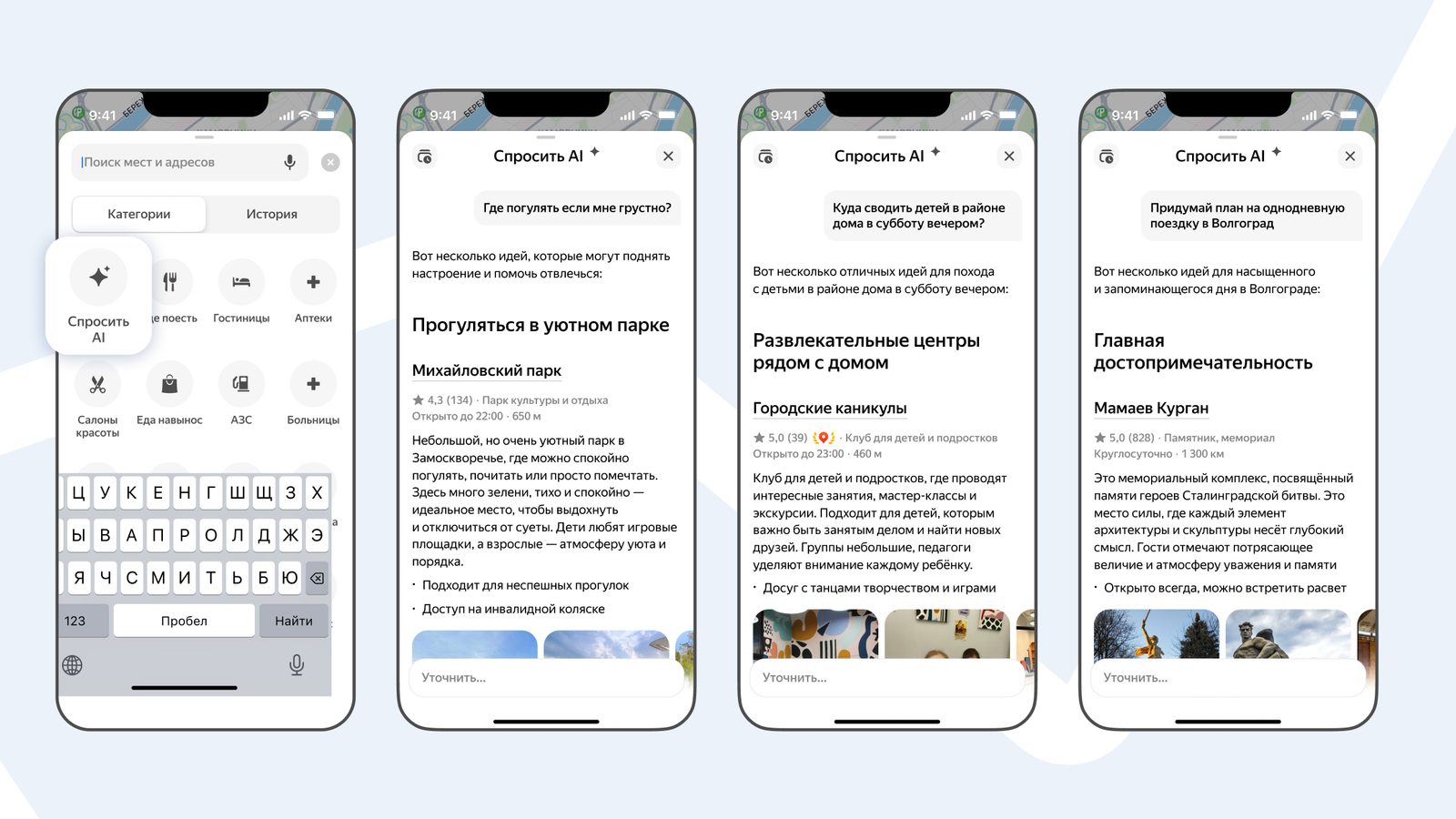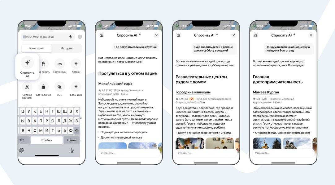 Как рассказали в пресс-службе, ИИ помогает планировать досуг, предоставляя подборки и обзоры мест, а также может составить план дня в поездке. Он понимает сложные запросы, учитывает контекст и пожелания пользователя, например, «Куда сходить с детьми в районе дома в субботу вечером?» или «Где нам с друзьями встретиться, если я живу на Соколе, а они — на Белорусской?»