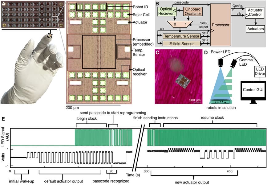 При размерах, сопоставимых с микроорганизмами вроде инфузории-туфельки, а именно 0,2 х 0,3 х 0,05 миллиметра, учёные сумели уместить на корпусе фотоэлектрические элементы для питания, датчики температуры, четыре схемы управления исполнительными механизмами, оптический приемник для нисходящей связи и программирования, процессор и память. Потребляет такой робот около 60-100 нВт. Благодаря этому робота можно запрограммировать на самостоятельное принятие решений в зависимости от условий.