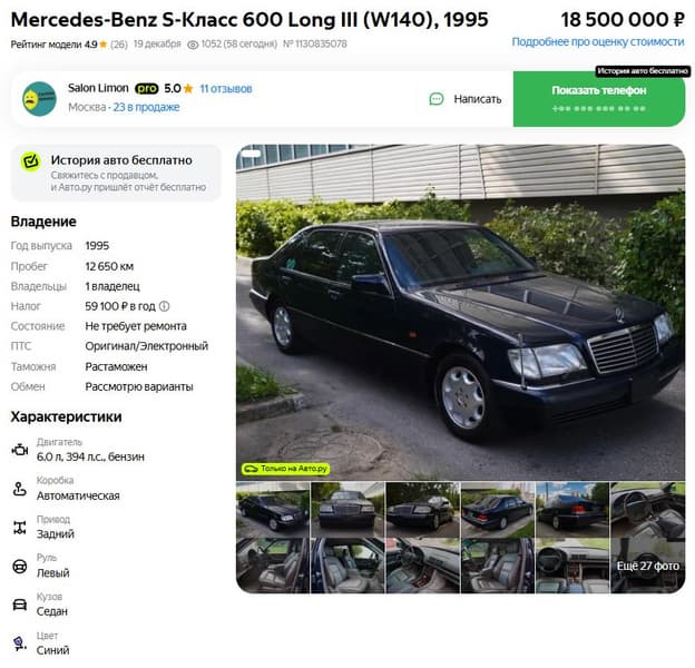 В Москве выставлен на продажу уникальный экземпляр культового Mercedes-Benz S 600 в кузове W140. За 30 лет этот автомобиль проехал всего 12 650 километров. Просят за автомобиль немало — 18,5 млн рублей. За такие деньги сейчас можно купить новый Mercedes-Benz S-класса или, например, Lexus GX550 — и еще на Lada Vesta останется.
