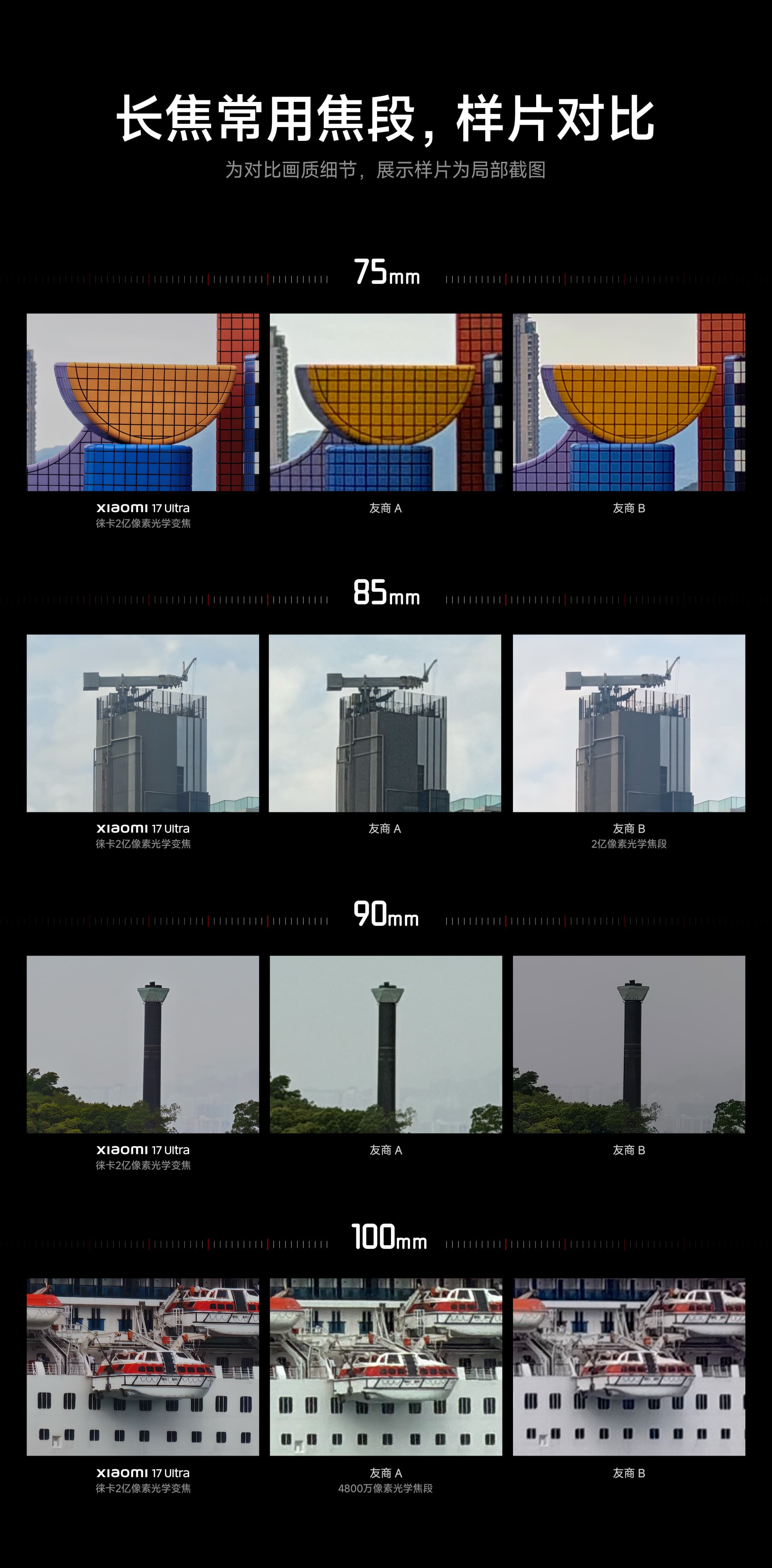 Для демонстрации возможностей оптического зума компания показала примеры снимков на наиболее востребованных фокусных расстояниях, а также детальные кропы изображений для наглядного сравнения. При этом слева показана работа камеры Xiaomi 17 Ultra, а посередине и справа — неизвестных флагманских смартфонов других производителей.