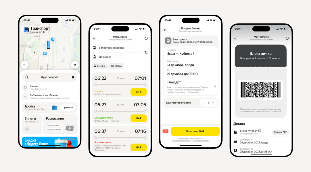 Доступен выбор маршрута на разных видах транспорта, включая пригородные поезда ЦППК. Оплата возможна картой или через СБП. Билет сохраняется в истории заказов и на главном экране приложения. Для прохода на станцию потребуется отсканировать QR-код на экране турникета или валидатора.