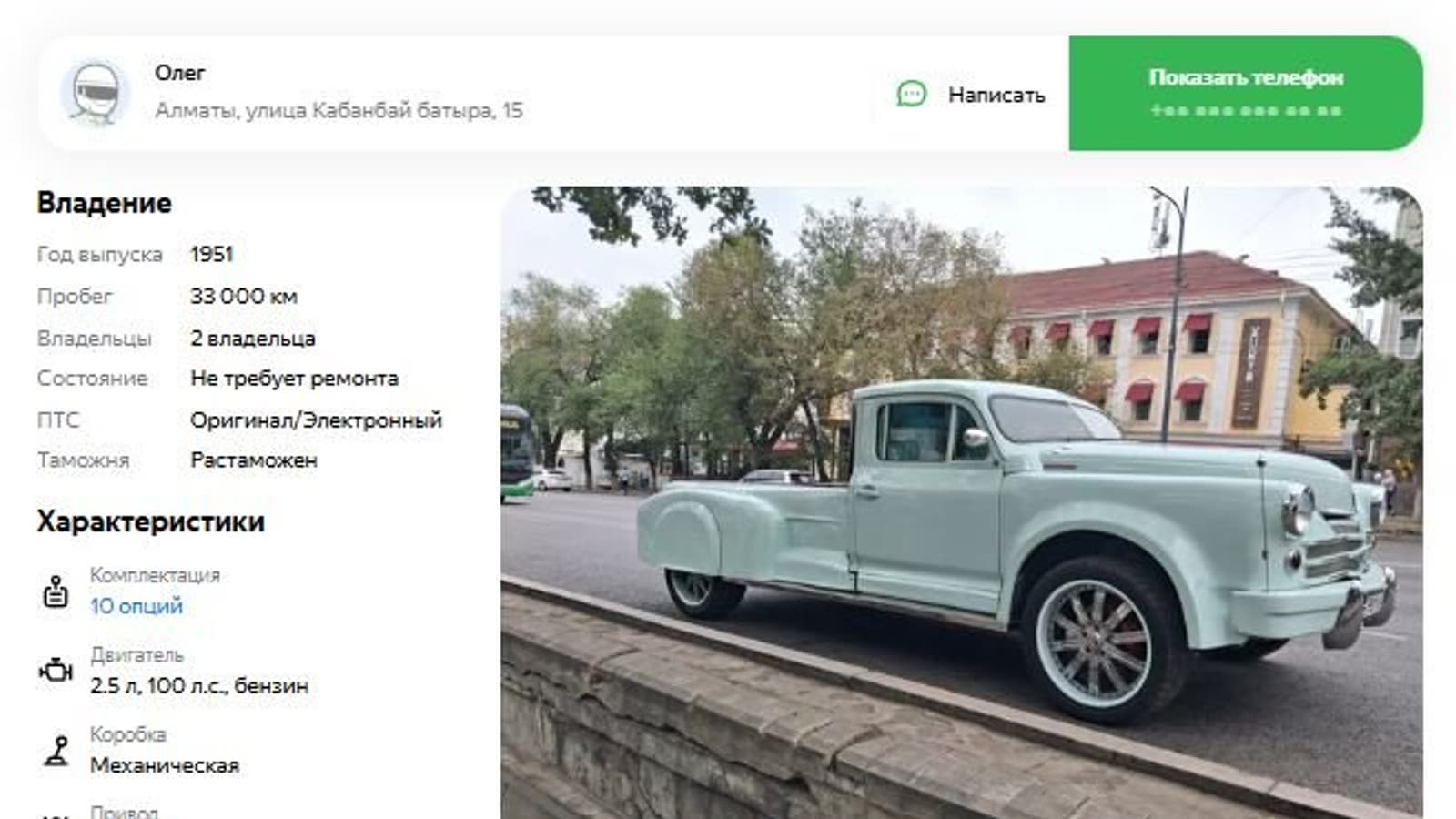 Машину оценили в 15 млн рублей, а находится пикап-«Победа» в Казахстане. Заявленный пробег составляет 33 тыс. км. Судя по номерным знакам на фото, автомобиль легально эксплуатируется на дорогах Казахстана. Однако вопрос о возможности постановки на учет в России такого глубокого тюнинга остается открытым.