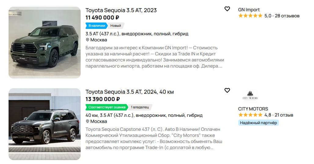 Самый дешевый внедорожник в наличии в Москве — машина 2023 года выпуска в комплектации TRD Pro предлагается за 11,49 млн рублей. В октябре Toyota Sequoia в топовом исполнении Limited можно было приобрести за 11,29 млн рублей — автомобиль был в наличии в Москве. Так что если ориентироваться на минимальные цены, то тут почти ничего не изменилось.