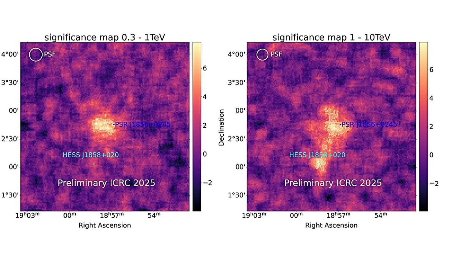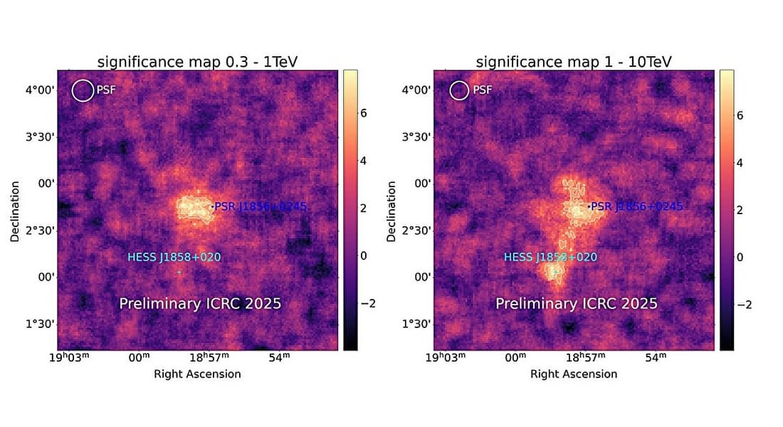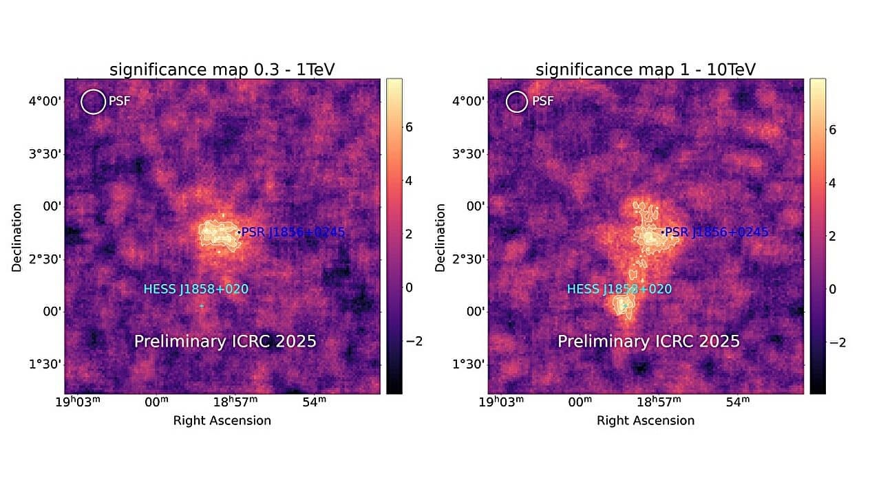 Согласно статье, карта значимости области вокруг HESS J1857+026 в диапазонах 0,3–1 ТэВ и 1–10 ТэВ показывает, что пульсар PSR J1856+0245 явно смещён относительно центра VHE-излучения. Это подтверждает предыдущие предположения о том, что гамма-излучение, наблюдаемое от HESS J1857+026, потенциально создаётся туманностью пульсарного ветра (PWN), питаемой PSR J1856+0245. Туманность пульсарного ветра – это туманность, образующаяся из частиц, разогнанных вращающимся пульсаром до релятивистских скоростей.
