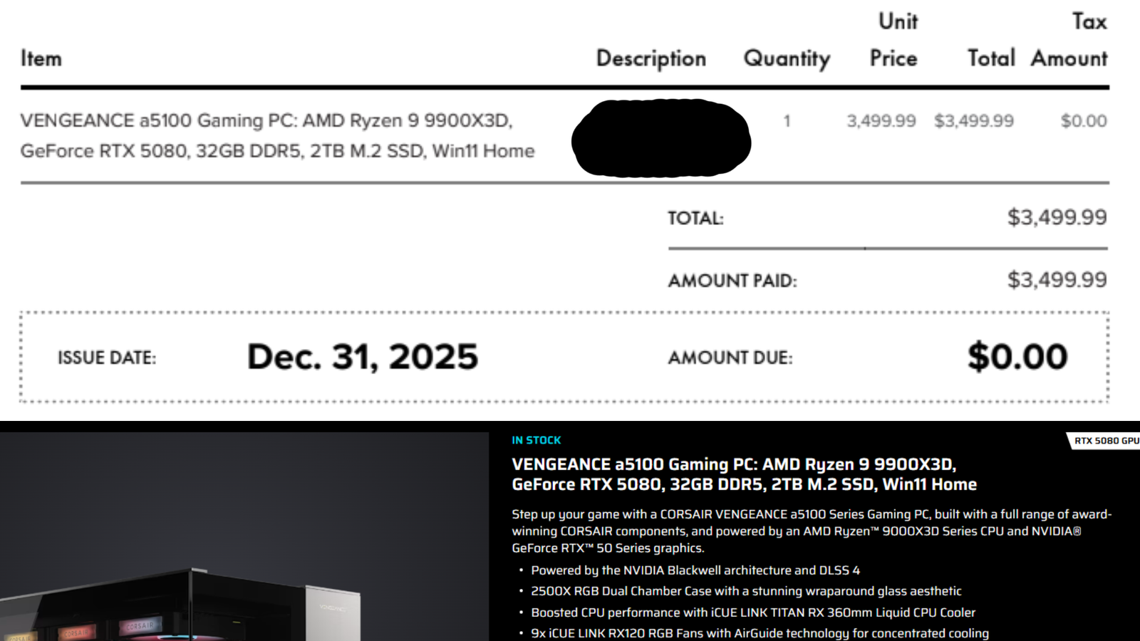 Здравствуйте, всем. Вчера я заказал VENGEANCE a5100 в качестве новогоднего подарка. При заказе цена составляла 3499 долларов, что соответствовало моему бюджету. Мне прислали счет, и я подумал, что все в порядке. Но сегодня, просмотрев свою электронную почту, я обнаружил, что Corsair отменила мой заказ без объяснения причин. Когда я попытался заказать тот же компьютер снова, я заметил, что цена выросла с 3499 до 4299 долларов. Я считаю, что они отменили мой заказ именно из-за повышения цены. Это крайне неприятно и несправедливо по отношению ко мне как к покупателю, и, к сожалению, я думаю, что в ближайшее время не получу достаточно мощный для меня компьютер