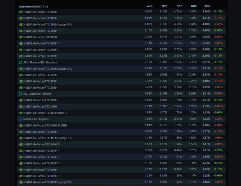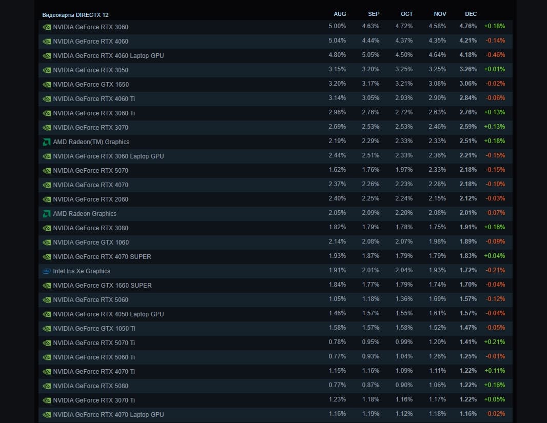 Карта вернула себе лидерство ещё несколько месяцев назад и продолжает его удерживать, что довольно необычно, так как давно уже вышла даже RTX 5060. На втором и третьем местах разместились RTX 4060 и 4060 Laptop.