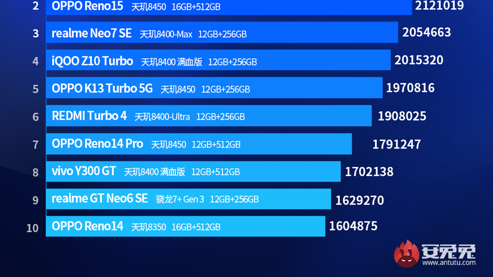 В нём лидирует свежий Oppo Reno15 Pro на основе SoC Dimensity 8450 с результатом более 2,1 млн баллов. Сразу за ним его собрат Reno15 на той же платформе и ниже Realme Neo7 SE на Dimensity 8400-Max. В целом почти вся десятка опирается на Dimensity 8400/8450, а единственной моделью на чипе Qualcomm является Realme GT Neo6 SE на девятом месте на Snapdragon 7 Plus Gen 3.