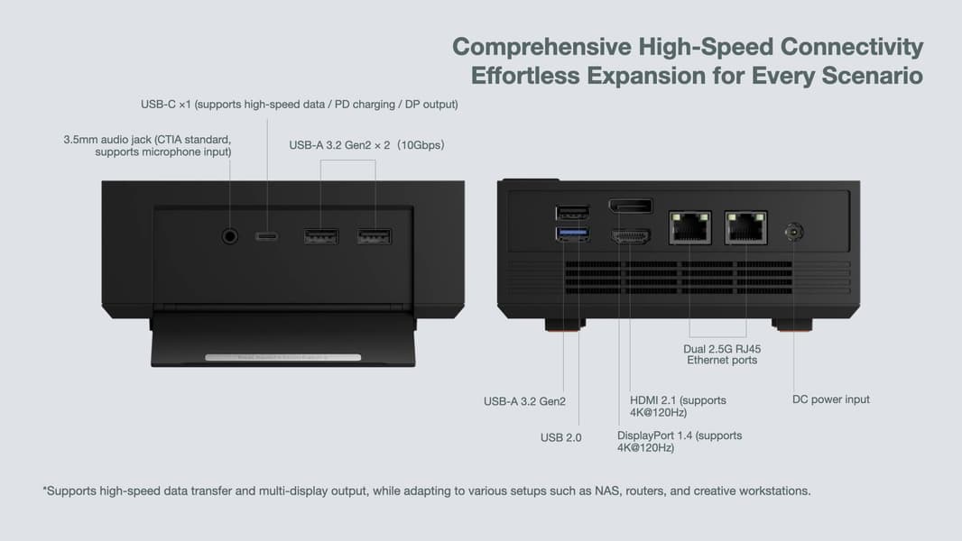 Из остального можно выделить встроенный динамик, порты USB, скрытые под крышкой на передней панели, пару RJ45, и отсутствие USB4 или Oculink, так что внешнюю видеокарту к этой модели подключить не выйдет.