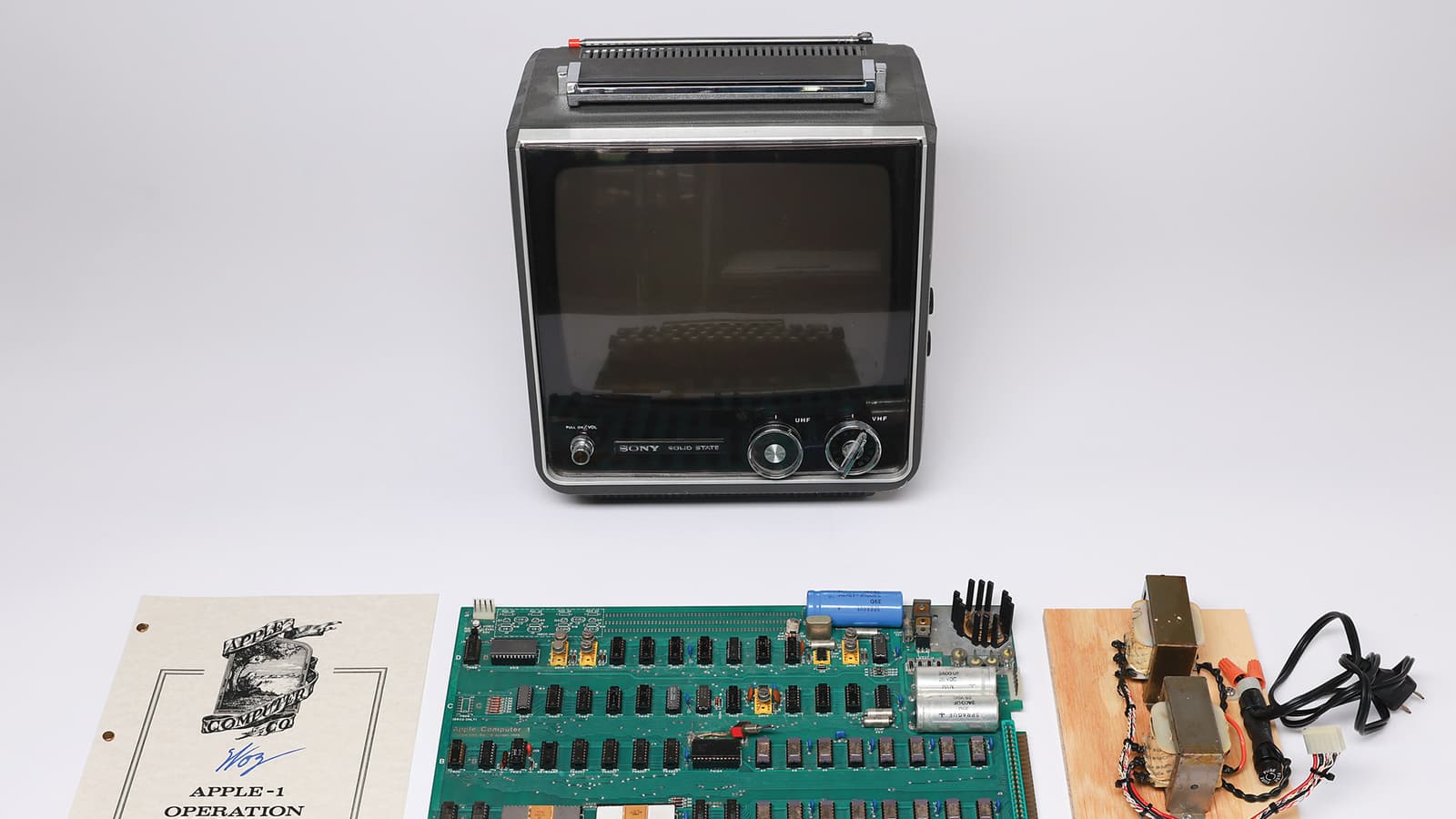 Покупатель лота получит не только плату, но также винтажную клавиатуру Key Tronic 1977 года выпуска, винтажный блок питания, винтажный телевизор Sony, копию руководства по эксплуатации Apple-1, подписанную Стивом Возняком, и копию схемы Apple-1, подписанную им же.