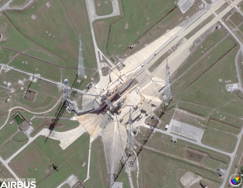 Кадры охватили сразу несколько знаковых объектов Космического центра Кеннеди. Помимо самой SLS, в объектив спутника попали стартовые комплексы LC-39A и LC-39B — площадки с богатой историей, использовавшиеся ещё во времена программы Apollo и шаттлов, а сегодня задействованные в новых лунных миссиях.