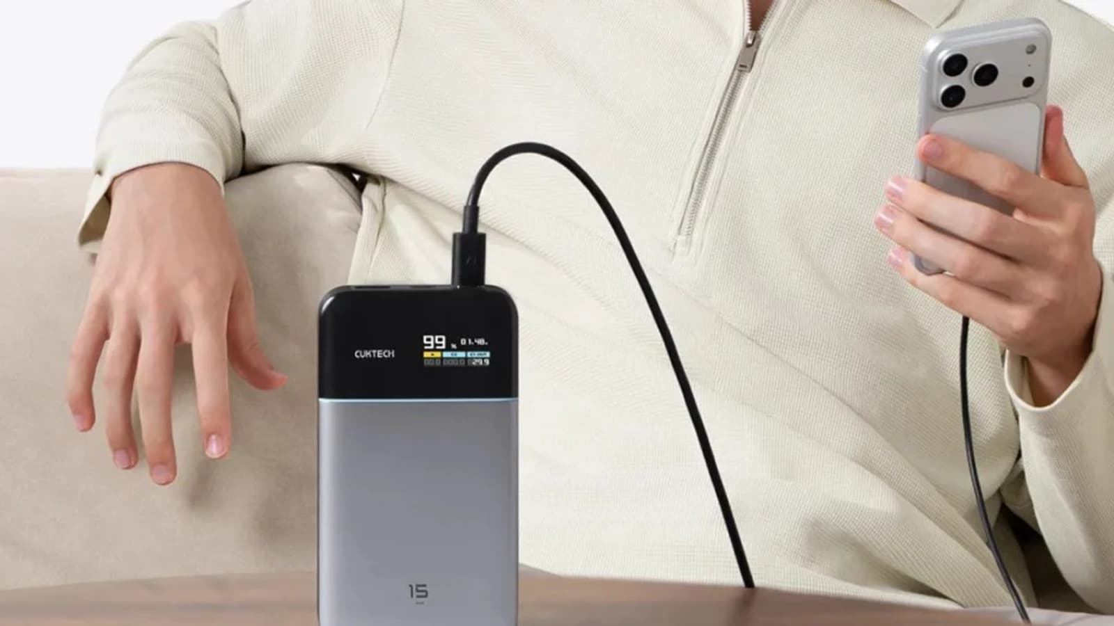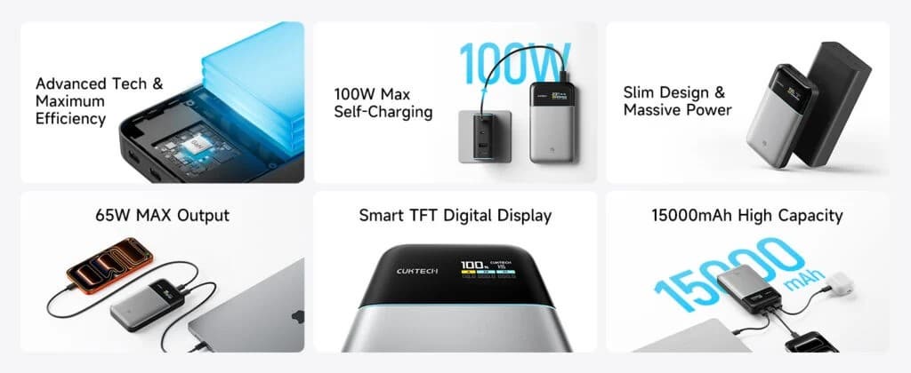 Новинка толщиной менее 25 мм весит 327 г, а по остальным размерам она меньше iPhone 17 Pro Max. При этом аккумулятор достаточно мощный и выдаёт 65 Вт, при этом сама батарея заряжается с мощностью в 100 Вт. Производитель говорит, что 15 Air может зарядить iPhone 17 Pro Max до 67% или MacBook Air M3 до 48% всего за 30 минут. В комплекте поставляется кабель, рассчитанный на мощность до 240 Вт.