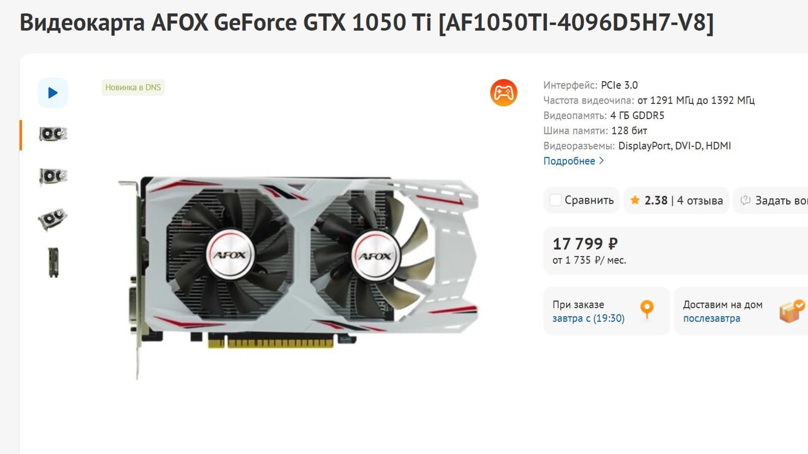 Предлагается видеокарта от AFOX в исполнении с двумя вентиляторами (у GeForce GTX 1050 Ti были варианты и с одним вентилятором) за 17 800 рублей. При этом самые доступные варианты GeForce RTX 3050 с 6 ГБ памяти стартуют от 20 000 рублей.