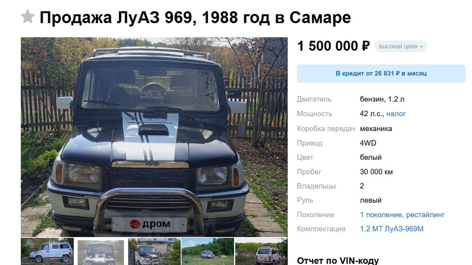 В Самаре на продажу выставили ЛуАЗ-969м 1988 года выпуска, известный как «Ивашка». Просят за серьезно переделанный советский полноприводный внедорожник немало — 1,5 млн рублей. Это самый дорогой ЛуАЗ в России, если ориентироваться на каталог сайта Drom.ru, в базе которого «Ивашка» и представлен.
