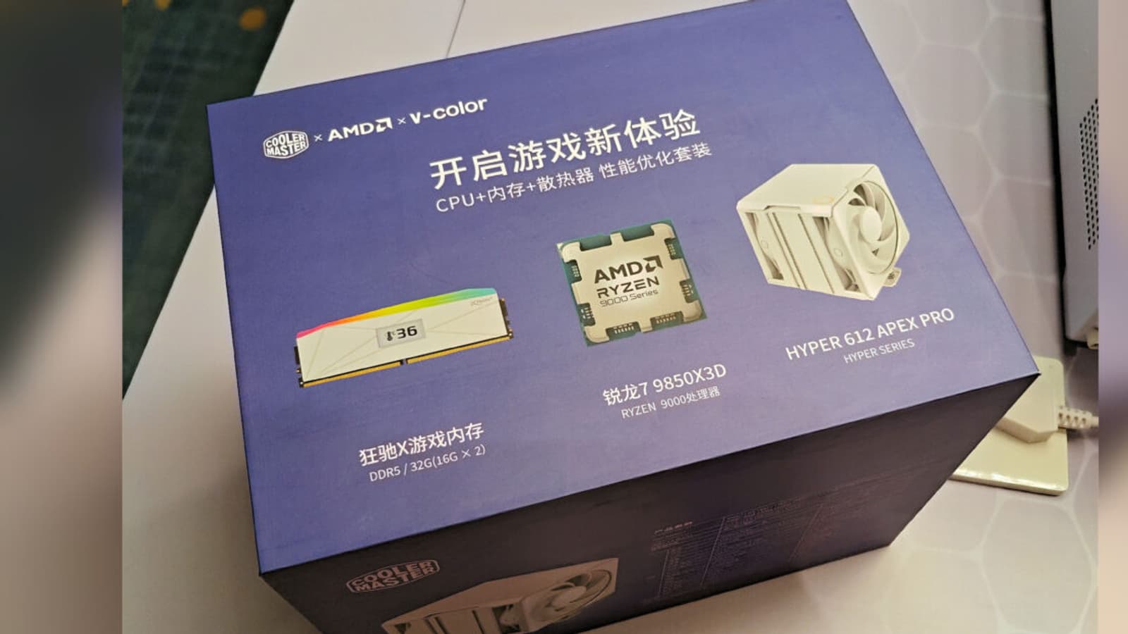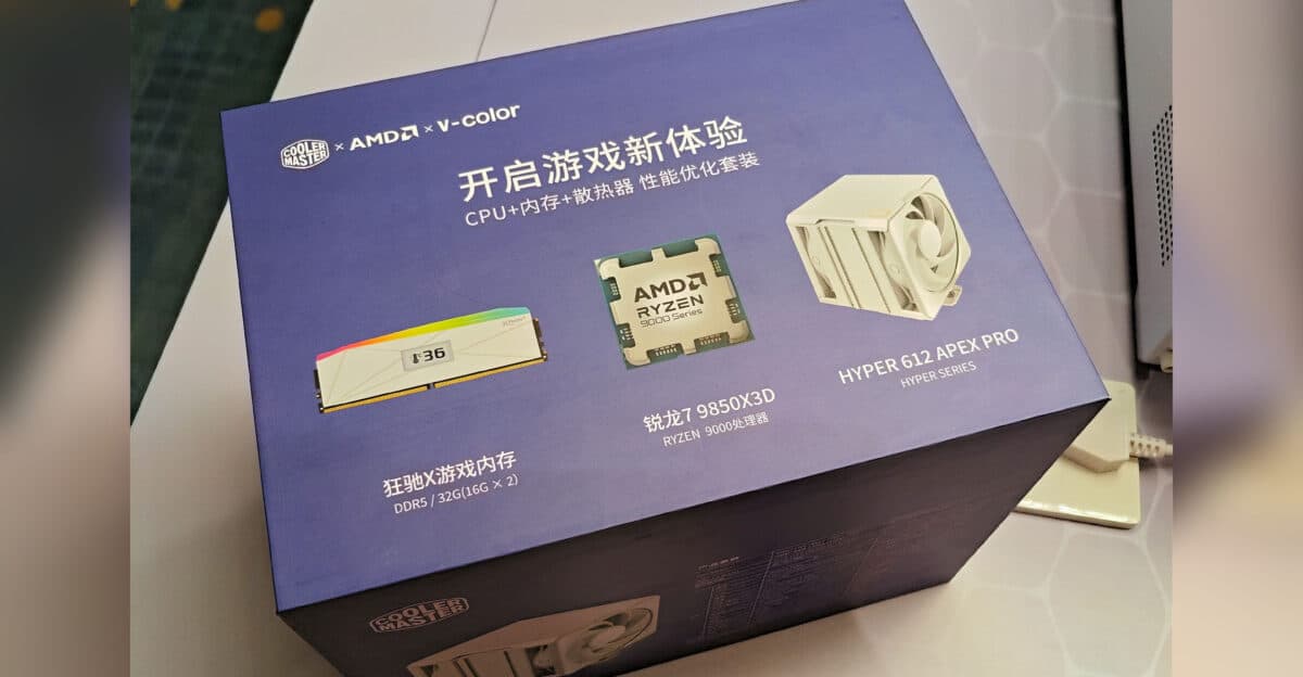 Судя по упаковке, в комплект входят: сам CPU Ryzen 7 9850X3D (официальный релиз состоится 29 января, цена уже объявлена — 500 долларов), мощный воздушный кулер Cooler Master Hyper 612 APEX PRO и комплект памяти DDR5 2 х 16 ГБ с таймингами CL36.